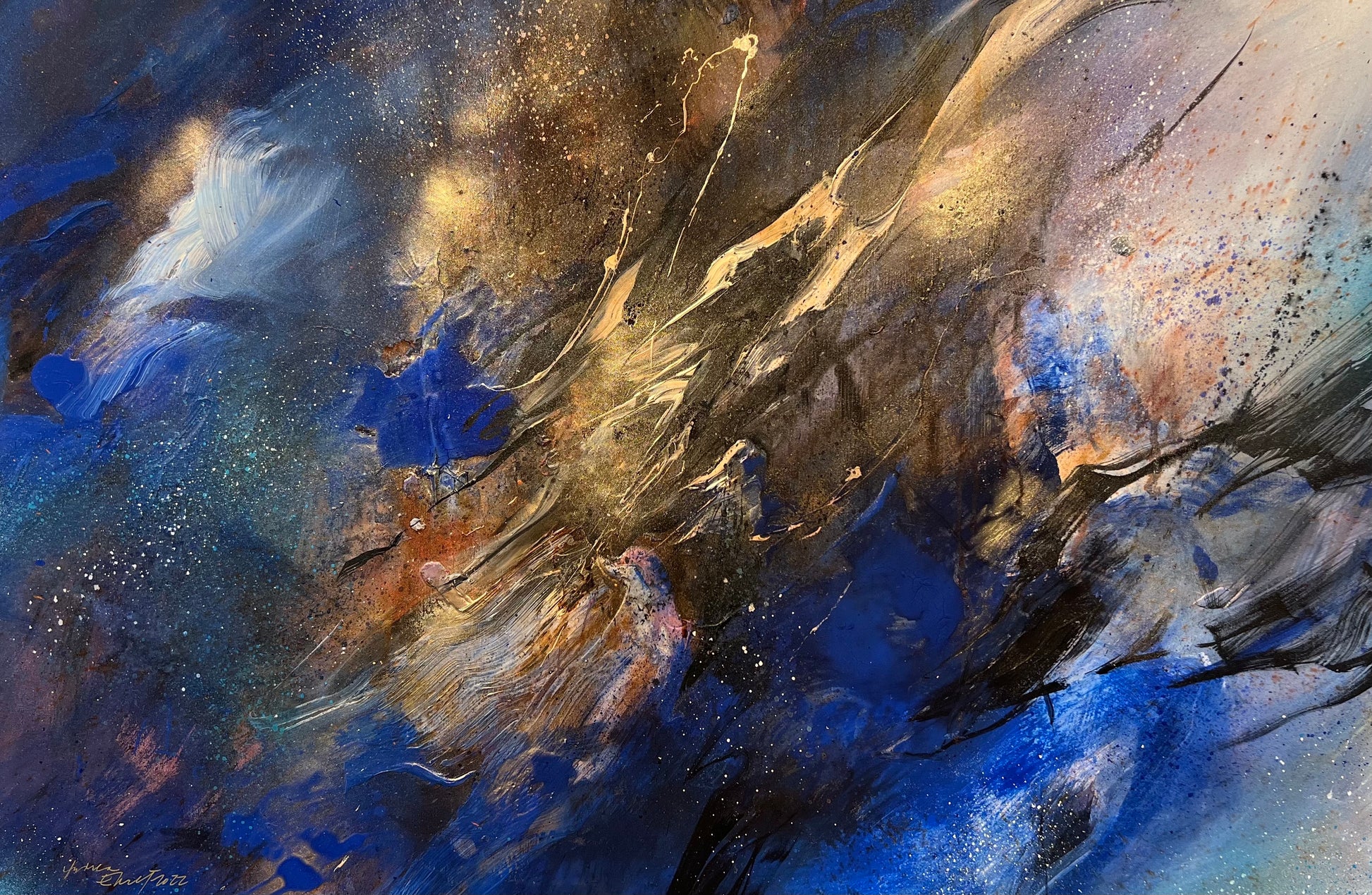 Her intuitive approach is influenced by Eastern philosophy. Ehret considers each painting an expression of an inner world – a meditative process in which the paint is layered with her own internal charges depicting vulnerability, anger, frustration, tenderness. These conflicting emotions coalesce in painterly abstract dreamscapes with the chromatic variation of raw uncut gems wherein the paint – spontaneously and expressively brushed explodes – performing a sort of cosmic dance. As Ehret herself has said of her painting “there is this longing for dream-like experience, where everything is possible.”